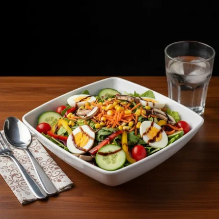 Sliced eggs, mixed greens, cucumbers, corn, carrots, mixed peppers, tomatoes, mushrooms, balsamic vinaigrette